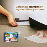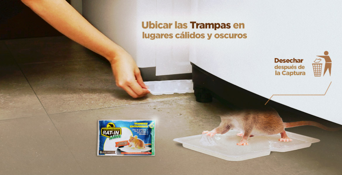 Coloque las Trampas Engomadas de RAT-IN MINI, en intervalos de un metro de distancia entre trampas, en lugares como: detrás de refrigeradoras, estufas, lavadoras, a lo largo de las rastreras, las esquinas y sobre todo los tumbados lejos del alcance de niños y mascotas. Revisar la trampa engomada cada 24 horas.